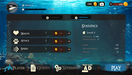 进入界面后可使用金币提升虎鲸属性点,通过数据面板了解基础能力情况,确认后点击开始按钮进入海域开启探索与生存过程。