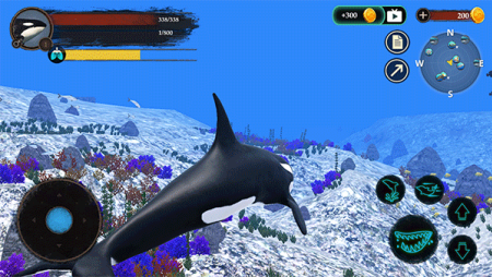 左侧摇杆控制移动方向与游动路径,右侧按键用于执行跳跃、喷水与攻击等动作,根据目标情况切换行为完成捕食或躲避。
