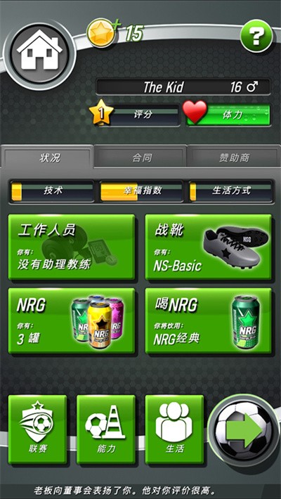 4、【技能成长】速度、力量、技术、视野、任意球五个维度独立升级。