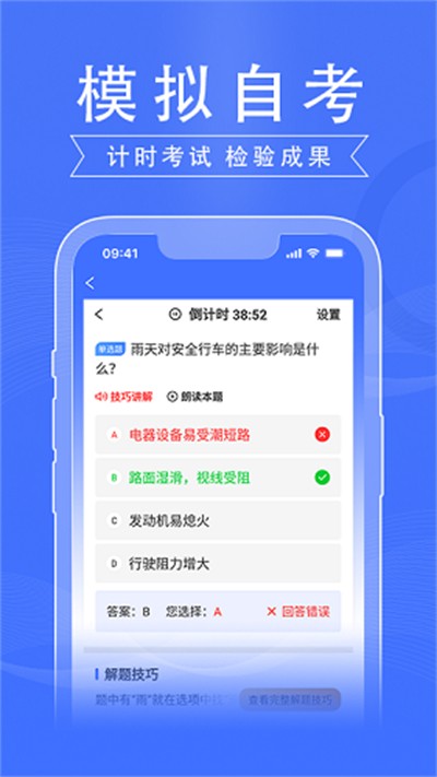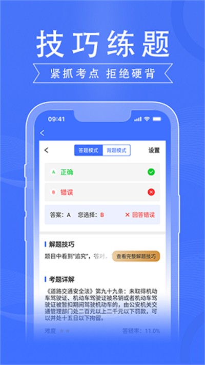 3、正式进入答题界面,可切换答题模式与背题模式,查看对应驾考题目,选择正确选项作答,还可点击技巧讲解或是朗读本题辅助理解知识点。