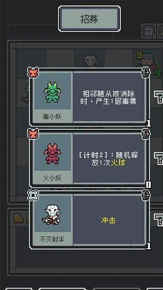 3、战斗间隙进入招募界面,选择新的随从或装备,搭配不同效果,强化阵容实力。