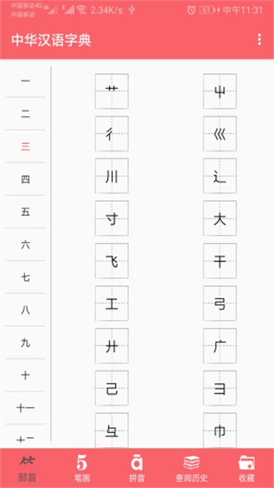 1、进入软件首页部首查询界面,左侧可以按数字笔画快速筛选分类,右侧展示基础汉字笔画示例,底部还设有部首笔画拼音查询历史收藏多个便捷功能入口。
