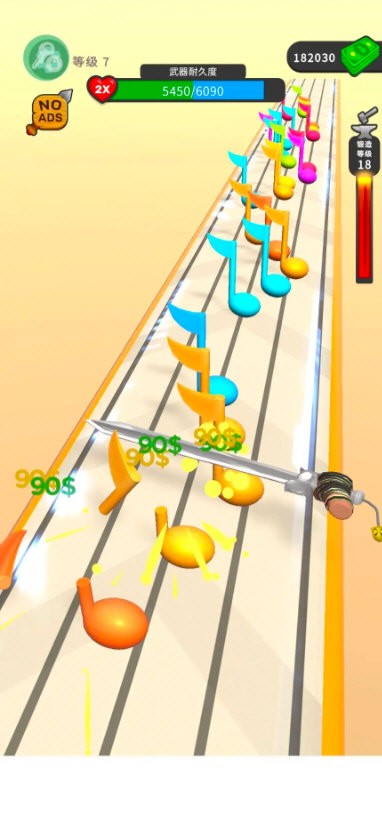 1、跑酷界面,根据指引左右滑动屏幕,控制手持武器的角色移动。