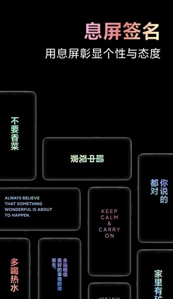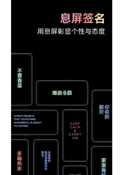 用户可自定义息屏签名、动态图案,自由搭配元素,打破模板局限,打造独一无二的手机界面。