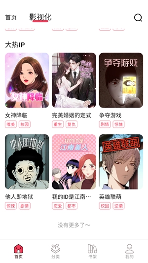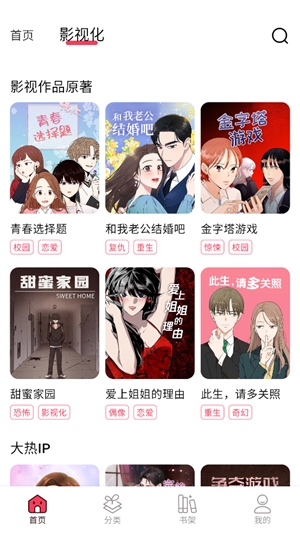 2、切换至“影视化”专区,能够查看众多热门影视作品的原著漫画以及高人气IP内容,带来更具沉浸感的阅读体验。