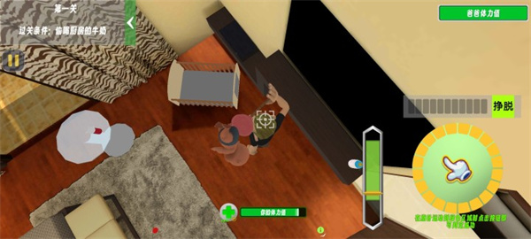 3、被爸爸抓住会扣除体力并增加失败进度,体力耗尽则游戏失败,可恢复继续挑战。