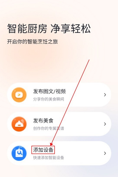 1、打开添可厨房App后,点击首页下方的橙色圆圈图标进入设备添加页面。