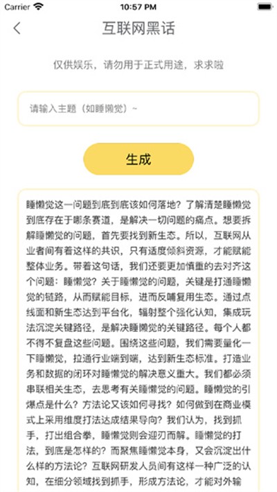 胡言乱语生成器是一款主打趣味文字创作的软件,搭载多风格语句生成机制,涵盖黑化文学打工人语录土味情话等类别,一键产出专属文字内容,填充社交聊天场景,规避对话冷场,解锁多元趣味社交体验。
