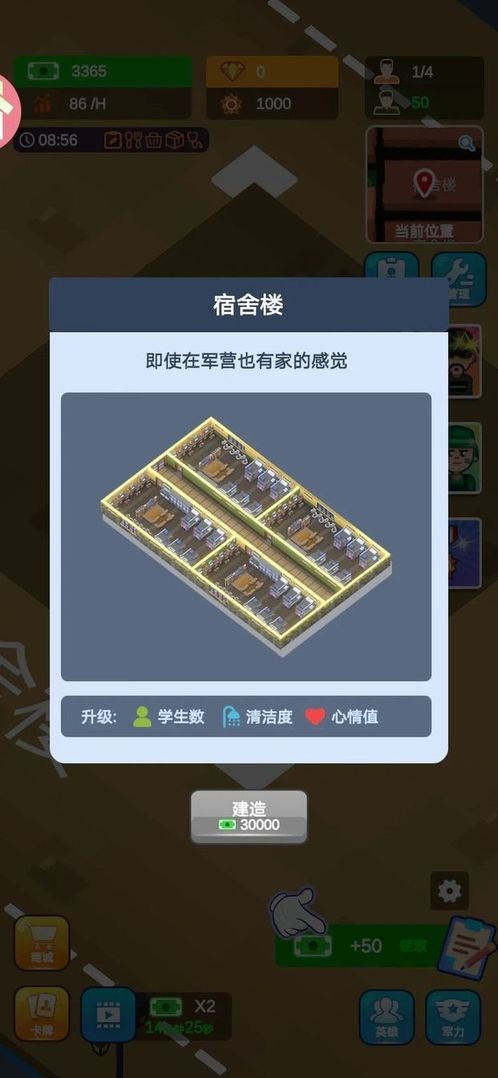 1、在宿舍房间界面,选择衣柜设施,花费对应金币点击建造按钮,完善收纳功能,让宿舍环境更整洁。