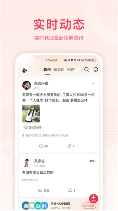 2、支持查看同城求职动态,在线交流求职经验,互帮互助找工作。