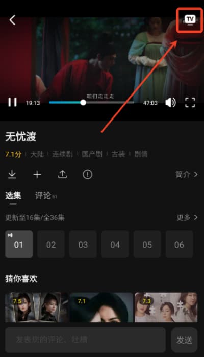 2、在播放界面右上角找到“TV投屏”图标,点击进入投屏功能。