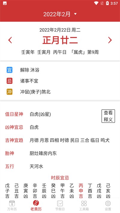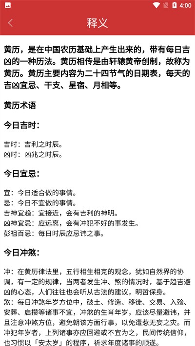 3、点击查看释义选项,进入黄历术语解释页面,了解相关术语含义。