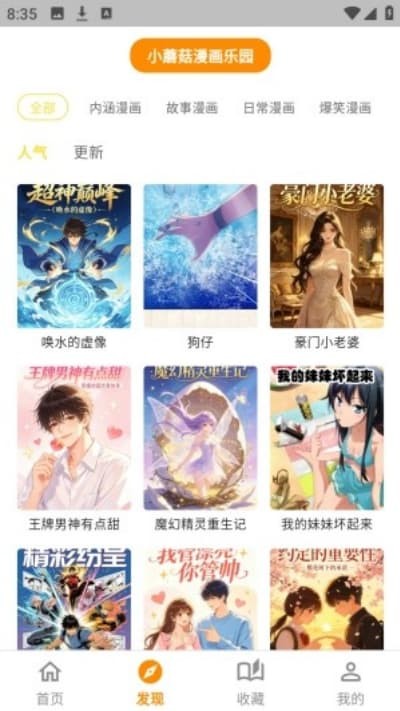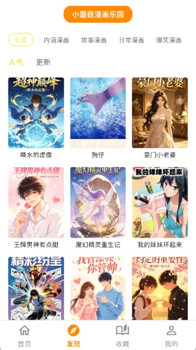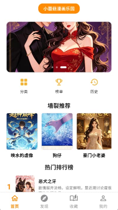 1、打开小蘑菇漫画乐园app进入首页,即可浏览系统推荐的各类漫画内容,快速发现感兴趣的作品。