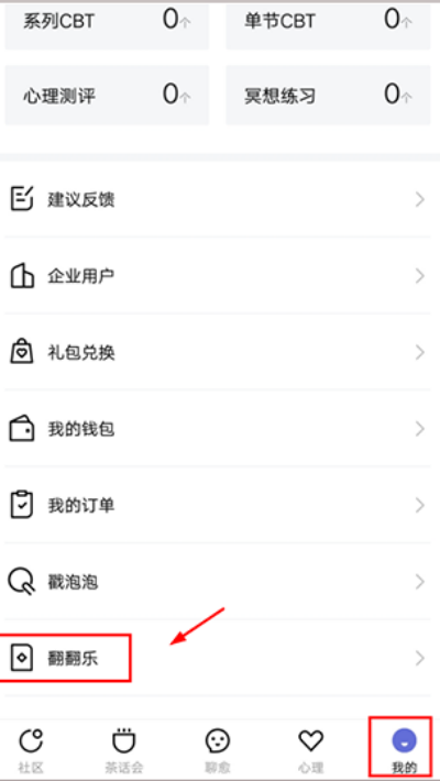 翻翻乐功能入口位于【我的】页面中,整体操作路径清晰,适合偏好心理小游戏与情绪调节内容的用户进行体验与探索。