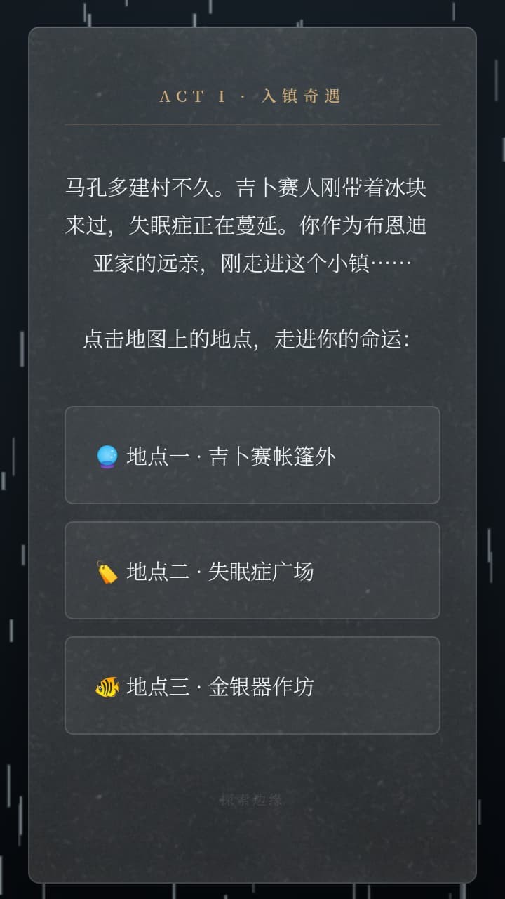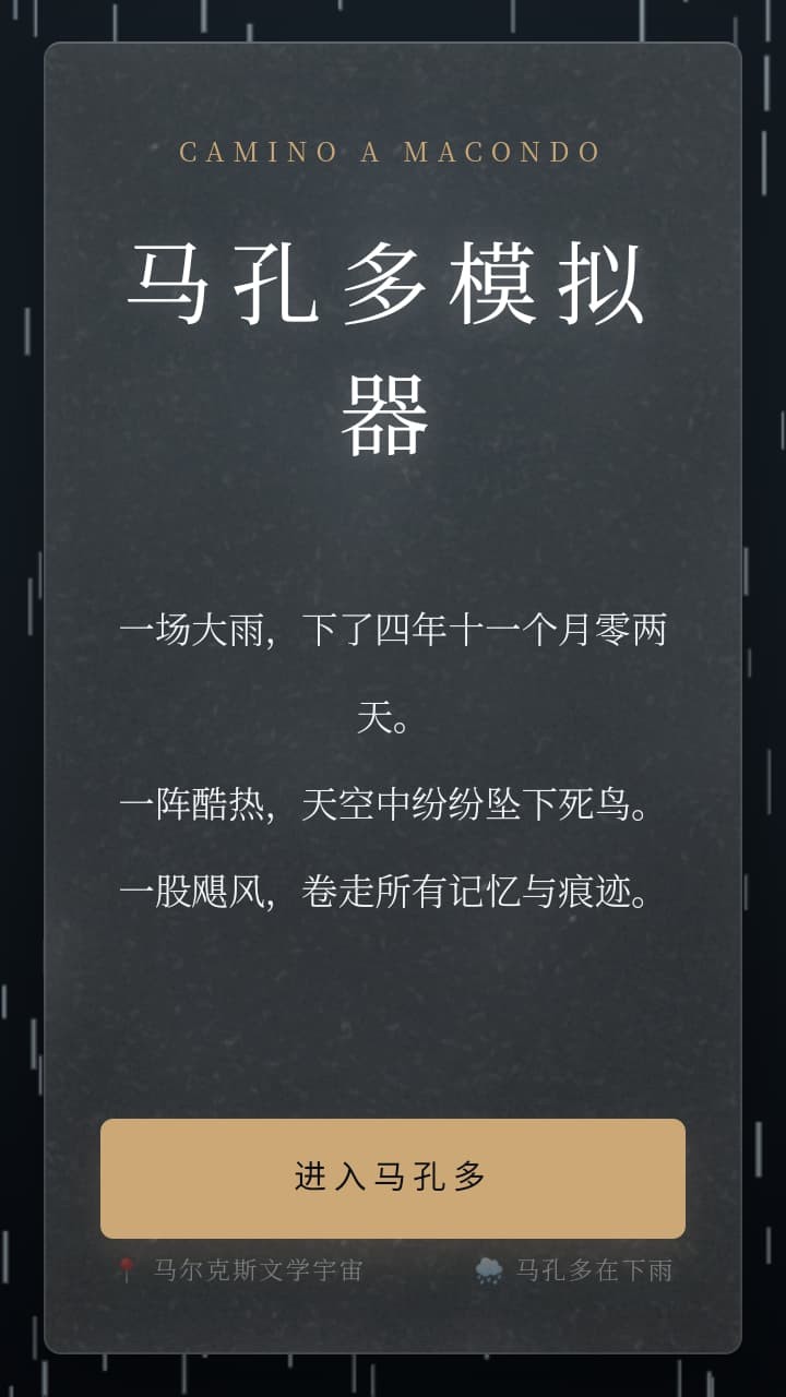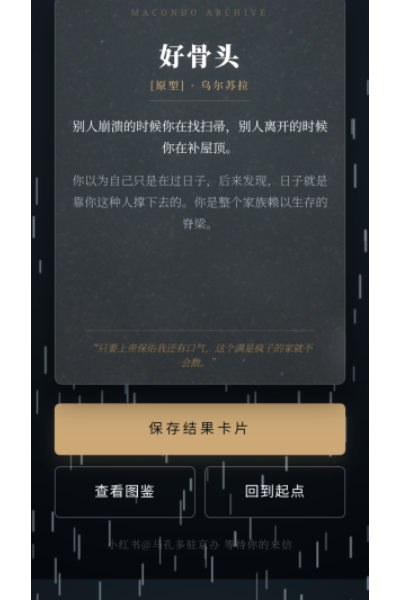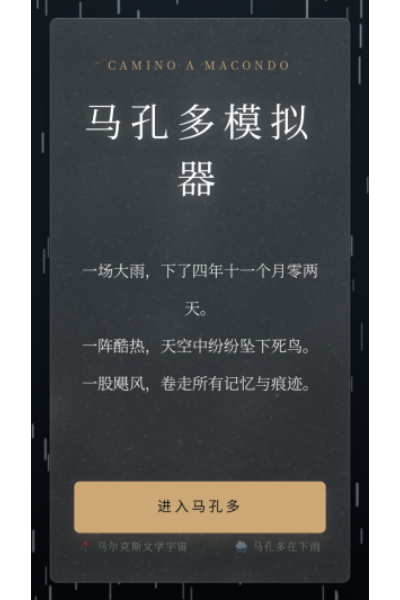 设置雨声白噪音、黄蝴蝶动态特效,搭配布恩迪亚家族树状图,还原原著场景,让用户沉浸文学氛围,更投入地探索自我命运。