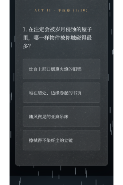 百年孤独命运模拟器以马尔克斯式魔幻叙事为核心骨架,深度融合《百年孤独》原著元素,将性格测试融入贴合原著的场景中,设计如面对羊皮卷预言、黄蝴蝶停留等专属情境,每一个选择都贴合布恩迪亚家族成员的行为逻辑,让测试更具文学质感。软件设置两个阶段测试,仅包含13道题目,作答高效便捷,测试结束后会基于用户选择生成专属人格分析报告,精准匹配契合的原著角色,深入剖析性格中隐藏的孤独密码,每一句解读都锚定原著文学内核,让用户在角色命运镜像中看清自我。软件内置专业音效团队还原的马孔多雨季之声,每一滴雨声都承载着布恩迪亚家族七代人的宿命感,助力用户卸下现实防备,沉浸于自我探索与文学体验之中。