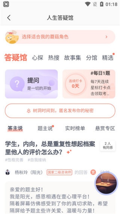 该心理社区类软件提供开放式问答交流功能,用户可在平台中提出心理相关问题并获得他人回应与支持,从而实现情绪疏导与经验分享的互动环境。