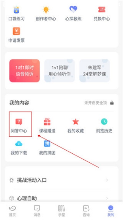 1、打开软件后进入【我的】页面,进入个人中心界面后选择中间菜单栏的【问答中心】入口。