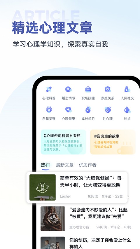 壹心理是一款专注于心理健康服务与情绪管理支持的专业心理成长平台软件,围绕心理咨询、情绪疏导与心理课程内容进行系统化整合设计,提供科学且可靠的心理支持体系。平台汇集专业心理咨询师资源与多类型心理服务模块,实现咨询预约、心理测评与成长学习的一体化管理。系统结合心理评估与内容推荐机制,优化情绪调节与自我认知路径。壹心理通过构建安全私密的心理服务环境,强化情绪表达与心理疏导能力,提升整体心理健康水平与生活质量,打造长期稳定的心理支持平台。