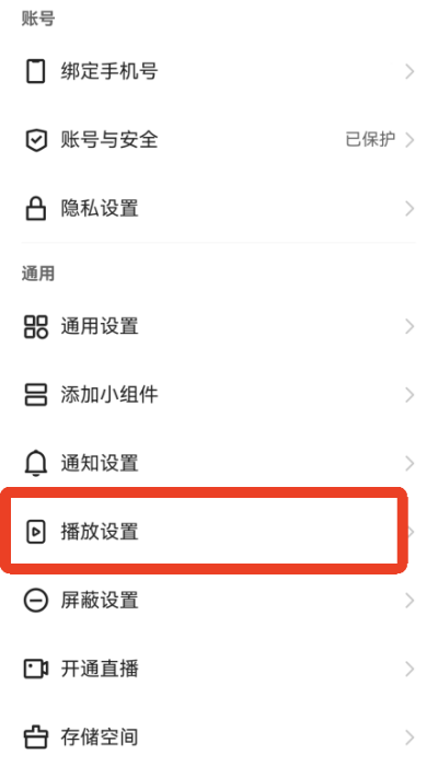 3、在设置页面的【通用】栏目下找到【播放设置】,点击进入视频播放相关功能配置页面。