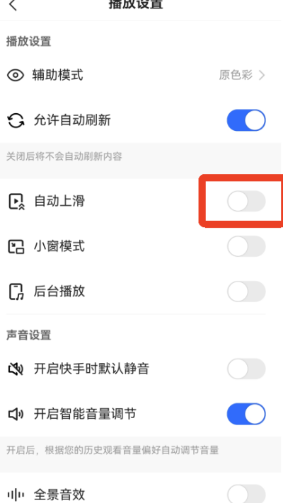 4、在播放设置中找到【自动上滑】选项,将右侧开关按钮开启,开启后视频播放结束将自动切换至下一个视频内容。