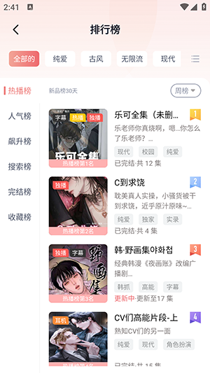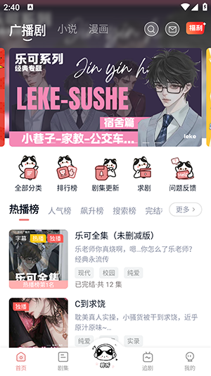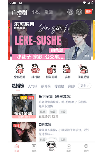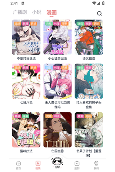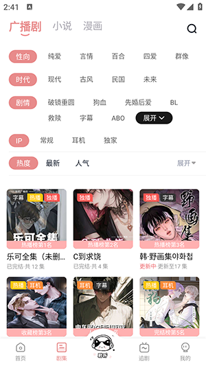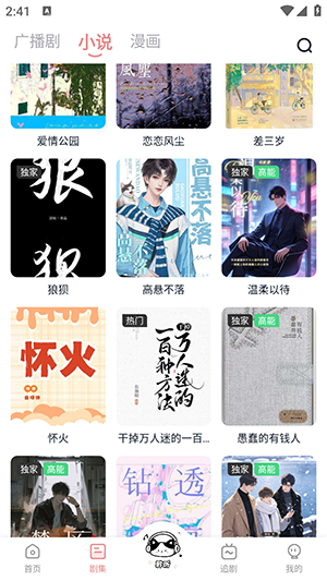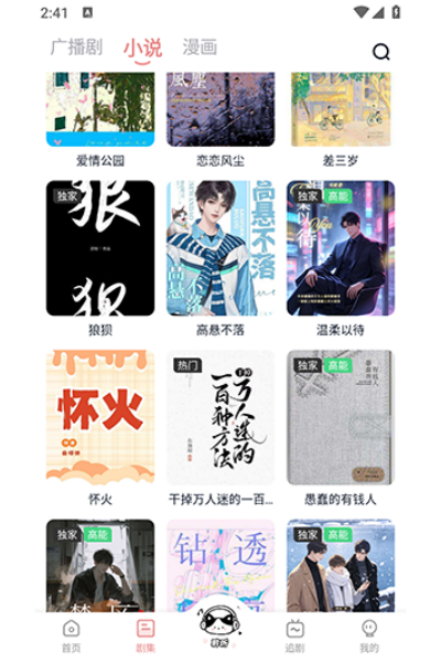 1、软件内置广播剧、小说、漫画三大核心板块,分类清晰明了。