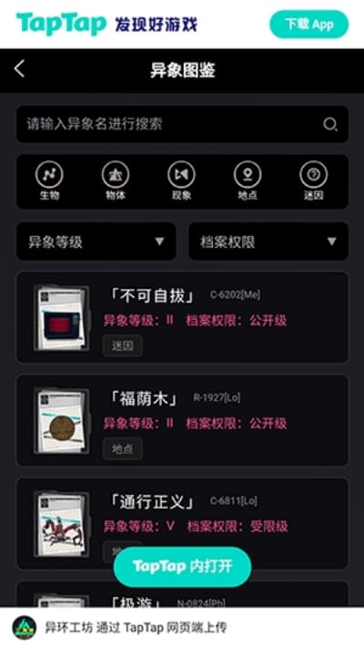 2、通过点击异象图鉴选项,即可浏览并检索异象类道具的相关资料。