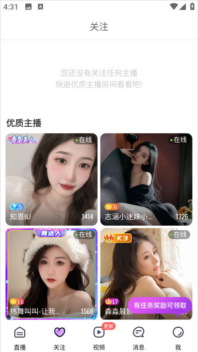 2、进入关注页面后可集中查看已关注主播动态,同时清晰显示主播当前开播状态,方便及时进入直播间。