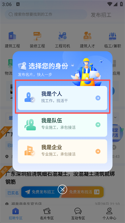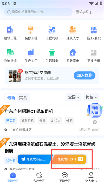 1、打开建筑港App进入首页,点击“免费发布找活”,可发布个人找活需求或浏览系统推荐匹配岗位信息。