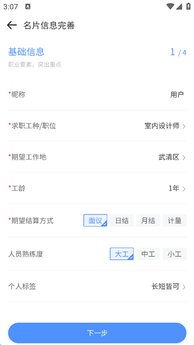 3、填写昵称、求职工种或职位(如室内设计师)、期望工作地点、工龄、结算方式及技能熟练度等信息后点击“下一步”。