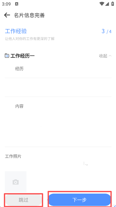 5、补充过往工作经历与项目内容,可选择上传工作照片进行展示,如暂无内容可直接点击“跳过”继续下一步。