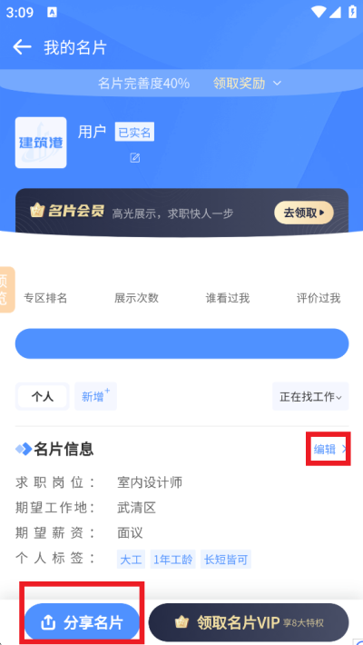 2、在弹出的身份选择界面中点击“我是个人”,进入个人名片基础信息填写页面开始资料完善。