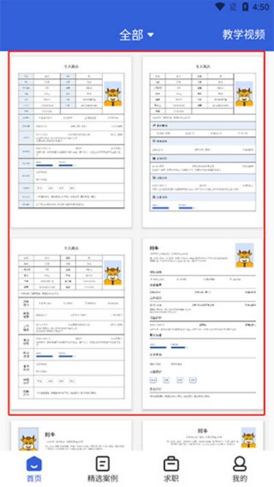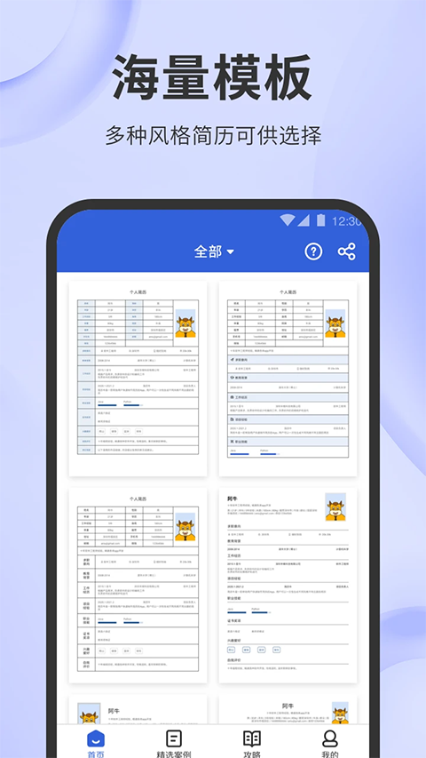 1、下载并安装简历牛App后进入首页,选择合适的简历模板开始简历内容编辑与创建。