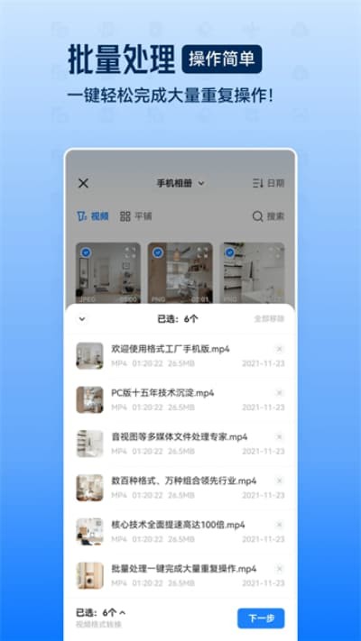 2、选择目标文件夹后,从列表中选中需要压缩的视频文件,确认无误后点击【下一步】进入参数设置步骤。