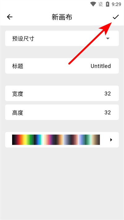 2、设置画布尺寸与标题后,点击右上角对勾按钮,创建新画布。