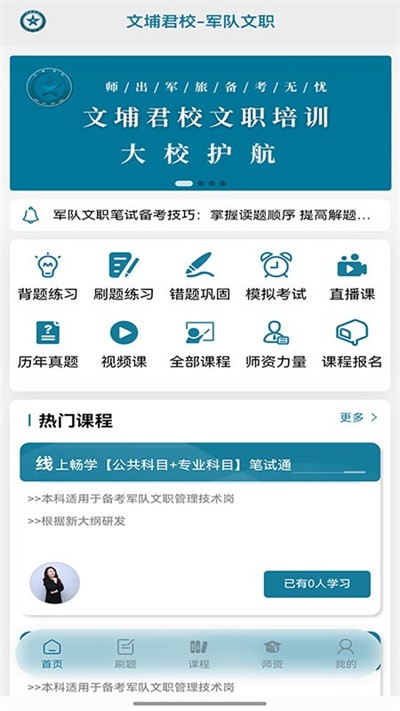 文埔君校是面向军队文职备考人群打造的专业学习软件,整合优质课程与系统化刷题体系,搭配名师授课以及互动课堂模式,构建学练一体的完整备考方案,助力用户高效备考。