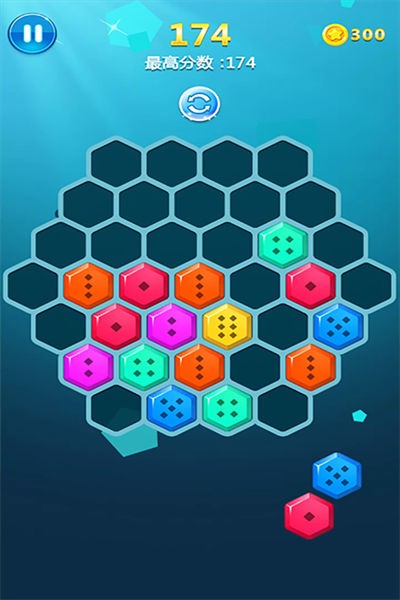 5、六边形消除在传统玩法基础上进行拓展创新,采用六边形布局,使消除方向更加自由,无论是横向、左斜还是右斜均可完成消除得分,策略性更强,当备选方块无法继续放置时游戏结束。
