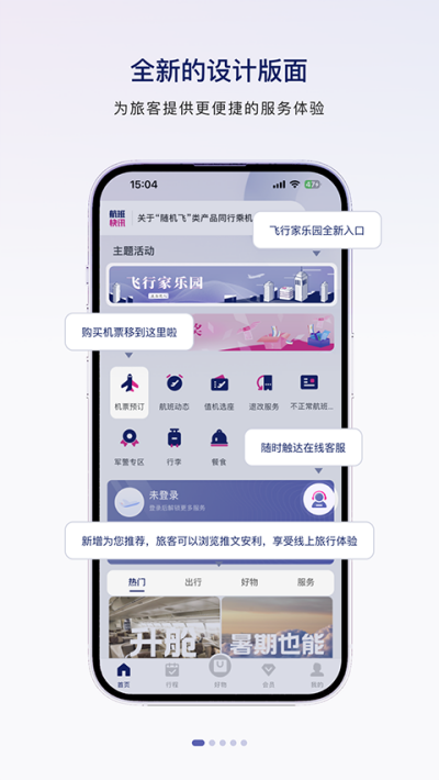 功能布局清晰易懂,订票、值机、购服务等操作简化,快速上手,降低使用门槛与操作耗时。