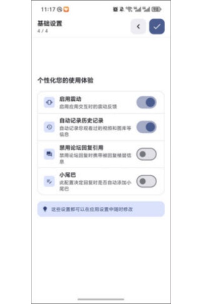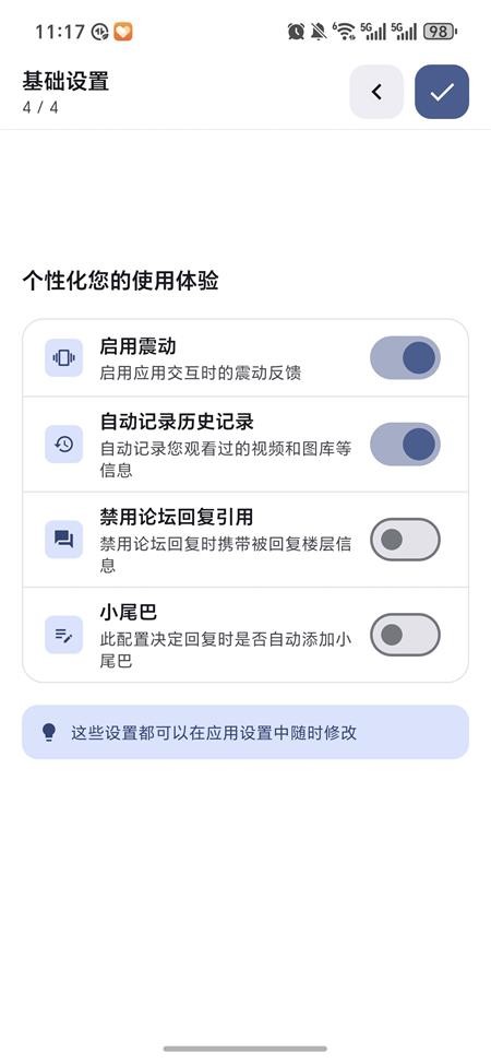 4、开启基础设置中所需项目,全部完成后点击右上角【√】进入主页。