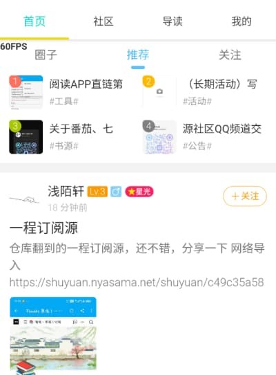 1、打开 源社区 后,在首页切换到“推荐”页面,即可查看七日排行榜中的热门书源内容。