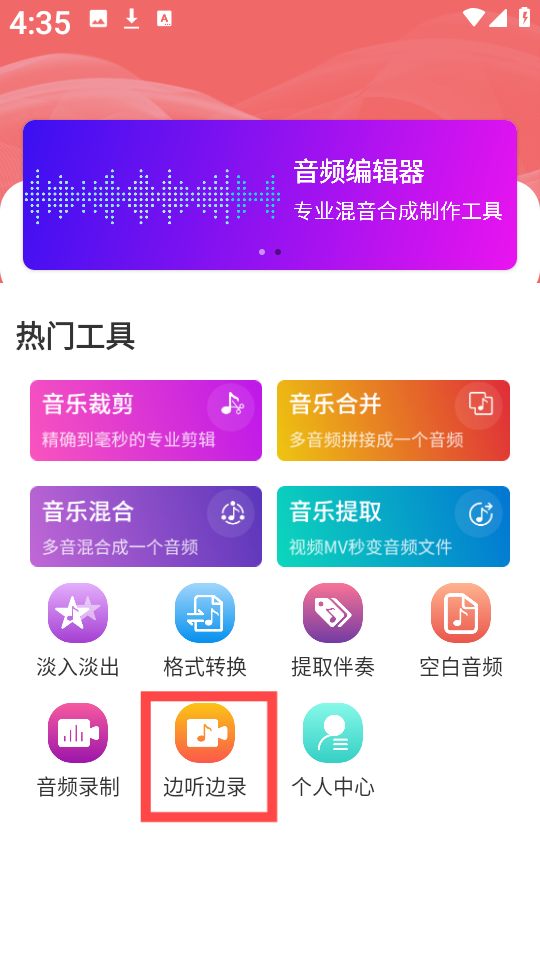 1、打开 江启音频编辑 后,在首页点击“边听边录”功能入口。