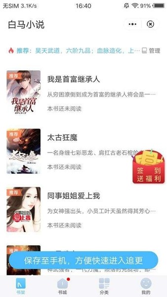 1、打开 白马小说 后,可以在书城页面浏览系统推荐的小说内容,点击感兴趣的作品即可进入阅读界面。