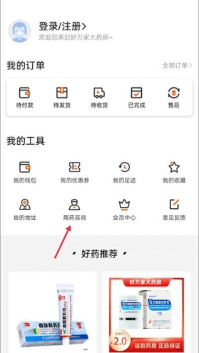 1、进入软件首页后切换至“我的”页面,在“我的工具”中点击“用药咨询”功能入口。