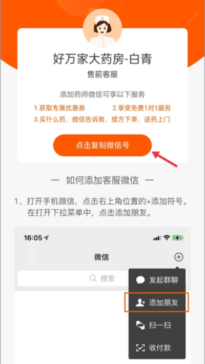 4、复制客服提供的微信号,通过微信添加联系,获取用药相关咨询服务。