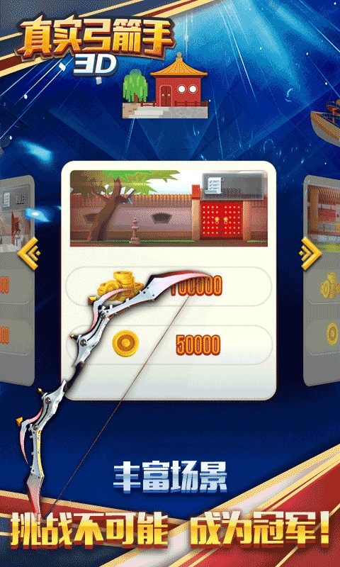 2、装备升级功能,可通过赛事奖励强化弓箭属性,不同弓箭具备不同性能表现与使用体验。