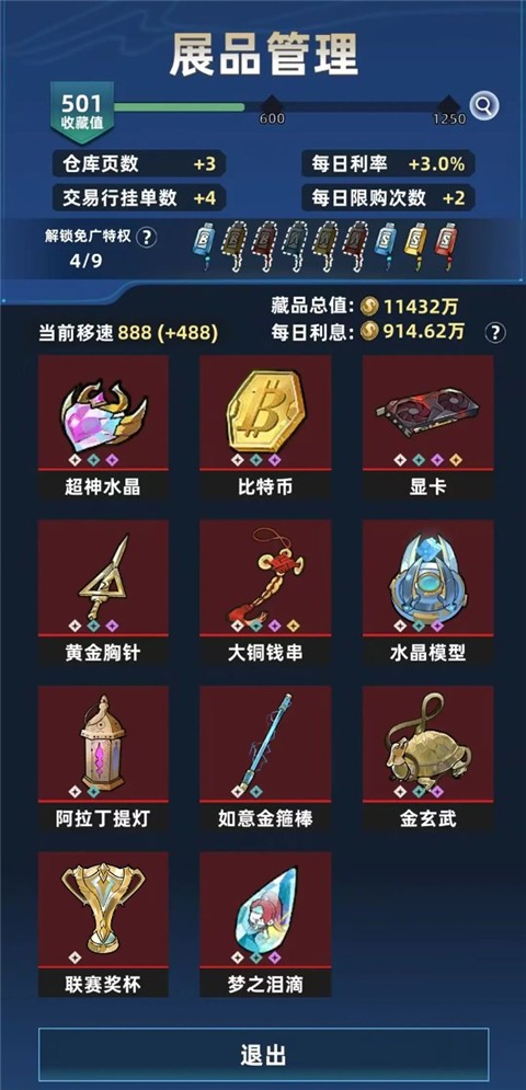3、交易与展馆系统,支持资源出售与藏品收益获取,通过升级提升整体回报能力。