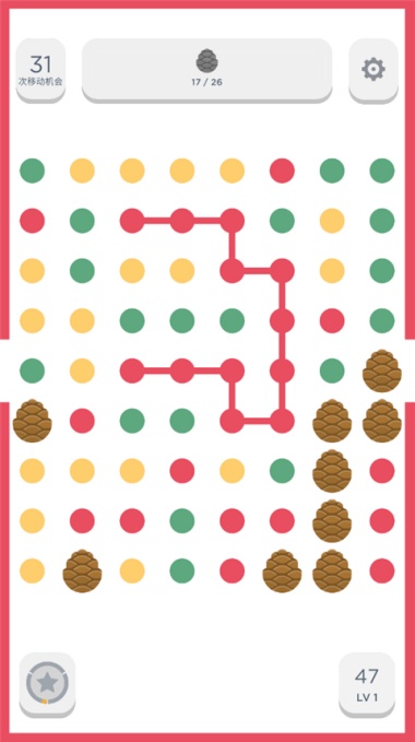 2、通过连接相同颜色的点进行消除,需按照连续路径连接,不能进行直角断开式操作。