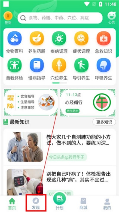 1、下载安装并打开养生通App,进入首页后点击“发现”板块。