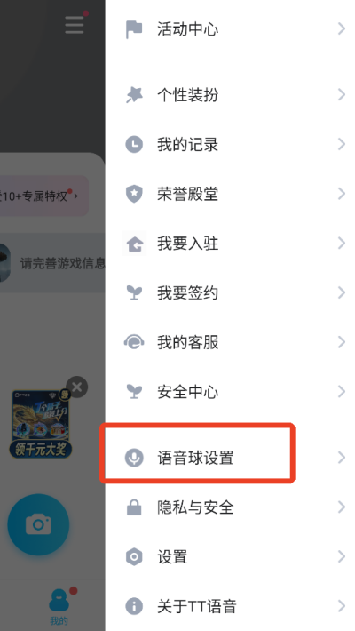 2、在菜单列表中下滑找到“语音球”设置选项并进入。