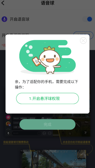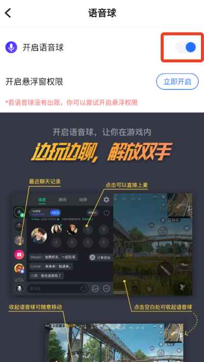 4、返回应用后语音球自动开启,关闭时点击蓝色开关按钮即可完成操作。